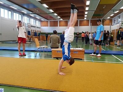 Nach dem Aufbau, den die Klasse 9 unter Aufsicht von Organisator Volker Harbrecht übernahm, konnten die Klassen 5-9 sowie die VKL-Klasse pünktlich um 9.30 Uhr mit dem Wettbewerb beginnen. An den verschiedensten Disziplinen wie dem Boden, Reck, Barren und Bock – betreut durch die Lehrerinnen und Lehrer - wurde mit Elan geturnt, unterstützt und angefeuert. Neben dem sportlichen Treiben herrschte in der Halle ein ausgelassenes und fröhliches Miteinander.