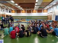 Nach dem Aufbau, den die Klasse 9 unter Aufsicht von Organisator Volker Harbrecht übernahm, konnten die Klassen 5-9 sowie die VKL-Klasse pünktlich um 9.30 Uhr mit dem Wettbewerb beginnen. An den verschiedensten Disziplinen wie dem Boden, Reck, Barren und Bock – betreut durch die Lehrerinnen und Lehrer - wurde mit Elan geturnt, unterstützt und angefeuert. Neben dem sportlichen Treiben herrschte in der Halle ein ausgelassenes und fröhliches Miteinander.