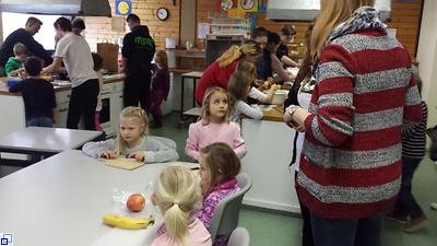 Beim Schälen und Schnippeln lehrten und unterstützten die Neuner ihre Schützlinge und dabei wurde viel gelacht, sich näher kennengelernt und die Obstsorten bestimmt.