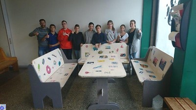Das erste durchgeführte Projekt des neuen Schulsozialarbeiters Peter Marx war die Restaurierung und Gestaltung der Sitzgruppe in der Schulaula. Die doch schon etwas in die Jahre gekommenen Sitzbänke und Tische wurden zunächst in ihre Einzelteile zerlegt. Die Holzstücke wurden dann in der Schreinerei Großmann mit großen Maschinen abgeschliffen. Die Zusammenarbeit hat den Jugendlichen nicht nur die anstrengende Arbeit mit dem Schleifpapier erspart, sondern auch einen tollen Einblick in den Beruf des Schreiners ermöglicht. Anschließend hat das Holz einen neuen Anstrich bekommen und wurde von den Schüler/Innen dekoriert. Hierbei wurden Motive am PC ausgedruckt und mit einer speziellen Technik auf das Holz angebracht. Zum Schluss wurde noch alles mit Klarlack versiegelt und konnte wieder zusammengebaut werden.