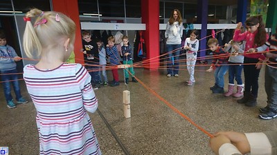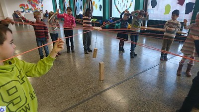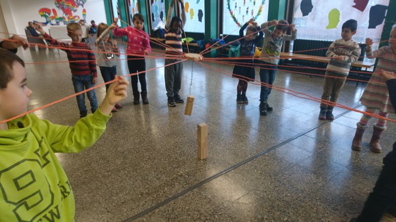 Unter Anleitung des Schulsozialarbeiters Peter Marx bekam die 1. Klasse z.B. den "Tower of Power" als Aufgabe gestellt. Nur wenn alle gleichzeitig an der Schnur zogen, gelang es den Holzklotz mit einem Bügel zu greifen und anzuheben. Die Kinder mussten sich aufeinander abstimmen und die Schnüre gespannt halten.