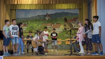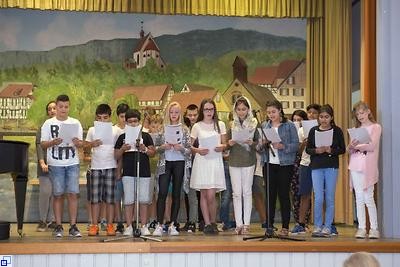 Für das Schülerkonzert am Dienstag, den 10.07. hatte Musiklehrerin Claudia Mnich ihre Schüler an der Johann-Belzer-Schule Weisenbach hervorragend vorbereitet. Für die Angehörigen und Freunde war es eine gute Gelegenheit, die gesanglichen Darbietungen der jungen Künstler zu genießen. Mit „Hey hello“ begrüßte Chor eins die zahlreichen Gäste in der Festhalle. Weitere drei Lieder folgten. Nina Göring begeisterte die Zuhörer mit einen gesanglichen Solobeitrag. Chor zwei zeigte seine musikalische Flexibilität mit fünf Liedern, darunter so bekannte Evergreens wie „ Über den Wolken“ von Reinhard Mey, „The Rose“ und „ der Löwe schläft heut Nacht“. Bei der Aufführung „Das rhythmische Klassenzimmer“ gaben die Akteure unter der Leitung von Irene Merkel dem Publikum akustisch einen Einblick in das Klassenzimmer, bevor der Lehrer kommt. Mit dem Singspiel „Der Riese Finn“ erzählte Chor eins die Geschichte des rotbärtigen Riesen Finn, der vom schwarzbärtigen Riesen zum Kampf herausgefordert wurde. Doch der Herausforderer wird von Finns Frau ausgetrickst und zieht von dannen. Claudia Mnich unterstützte die Vorträge am Klavier. Bei allen Beiträgen war den Sängerinnen und Sängern die Begeisterung anzusehen und sie wurden mit reichlich Beifall belohnt. Am Schluss zeigte die Schul-Band mit einem gelungenen Auftritt ihre musikalische Kreativität.