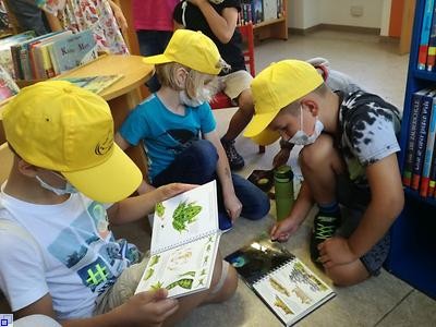 Anschließend durften die Kinder auf Erkundungstour in den Innenräumen gehen, wo sie sehr schnell in ganz unterschiedliche Bücherwelten abtauchten. Vor allem die „Licht an!“- und die Dinosaurier-Bücher faszinierten sie sehr.