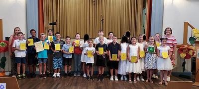 Dann war es so weit. Konrektorin Elke Fanselau übernahm das Wort zur Zeugnisausgabe. Das erste Mal in ihrer Laufbahn an unserer Grundschule hatte Frau Fanselau die Ehre, eine glatte 1,0 zu vergeben. Diese 1,0 hatte sich Julian Bleier verdient. Stolz nahm er sein Zeugnis mit Auszeichnung von Frau Fanselau entgegen.