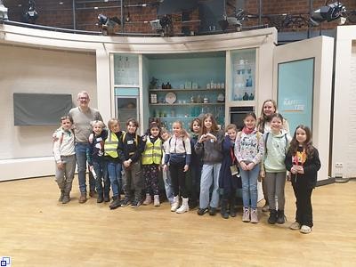 Auf dem geführten Rundgang entdeckten die Kinder Radio, Fernsehen und Internet. Sie staunten in den Fernsehstudios über Kameras, Strahler und Kulissen, wurden Geräuschemacher*in im Hörspielstudio und trafen auch Mitarbeiter*innen, die ihnen gerne über ihre Arbeit Auskunft geben.
